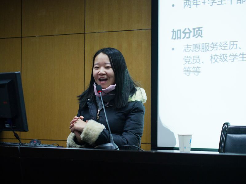 社会学系研一学生魏晶晶做讲演。她以ppt的形式,向同学们展示了她保研和志愿边疆的经历,并用自己的亲身体会向同学们诠释“奋斗的青春最美丽”这一话题。她给全体学生提出期望:惜时如金,不负时光。