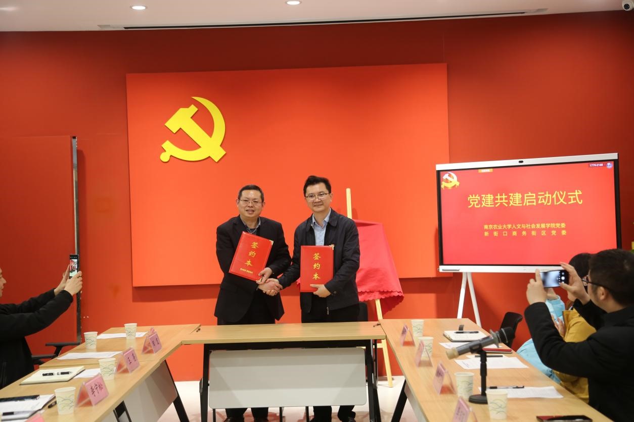 李宁松和熊富强共同为人文学院“党建+新街口商圈教育基地”揭牌。戚秋生和李日葵代表双方单位共同签署党建共建协议书。双方商定将在政治理论联学实践活动联办、推进产教融合协同创新发展、弘扬志愿精神聚力服务社会等方面加强交流互动。