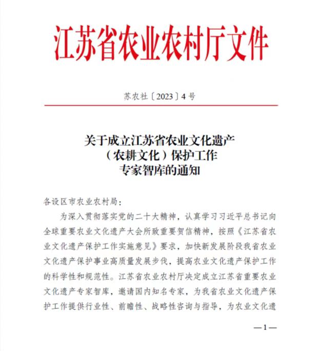 近日,江苏省农业农村厅苏农社[2023]4号文件发布了《关于成立江苏省农业文化遗产(农耕文化)保护工作专家智库的通知》,猫都论坛