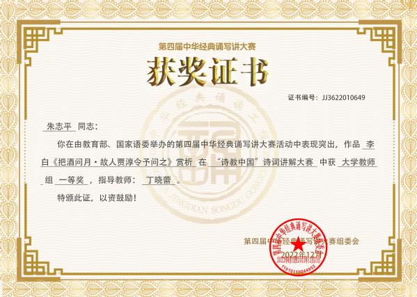 朱志平副教授的作品“李白《把酒问月·故人贾淳令予问之》赏析”通过网络初赛和现场直播决赛两轮比赛后,代表江苏入围全国总决赛。最终,其作品凭借扎实的语言能力和卓越的教学水平获得全国“诗教中国”诗词讲解大赛一等奖,丁晓蕾教授获优秀指导教师奖。