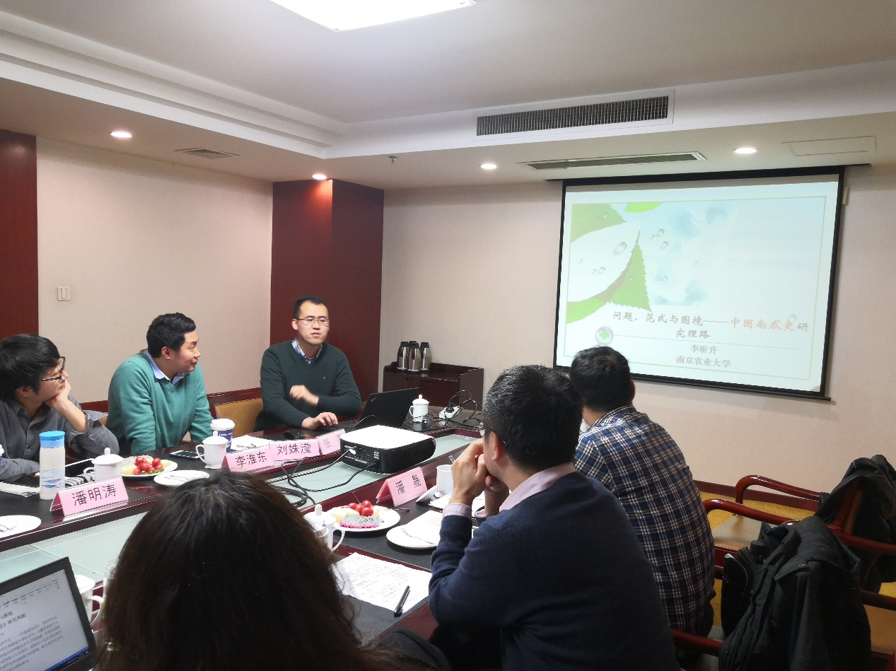 青年工作坊的下半场地会议在当日下午两点半准时进行。下半场的主持人是南京师范大学社会发展学院的潘晟教授,潘教授首先阐述了农业的重要性,同时提出农史研究还有很多方面的研究工作可以开展,并指出进行农史研究或许还应该考虑一下古代农业对于环境的改造,同时还可以关注土壤分析、农业考古、农业生态环境、作物制度与田间管理等方面内容。