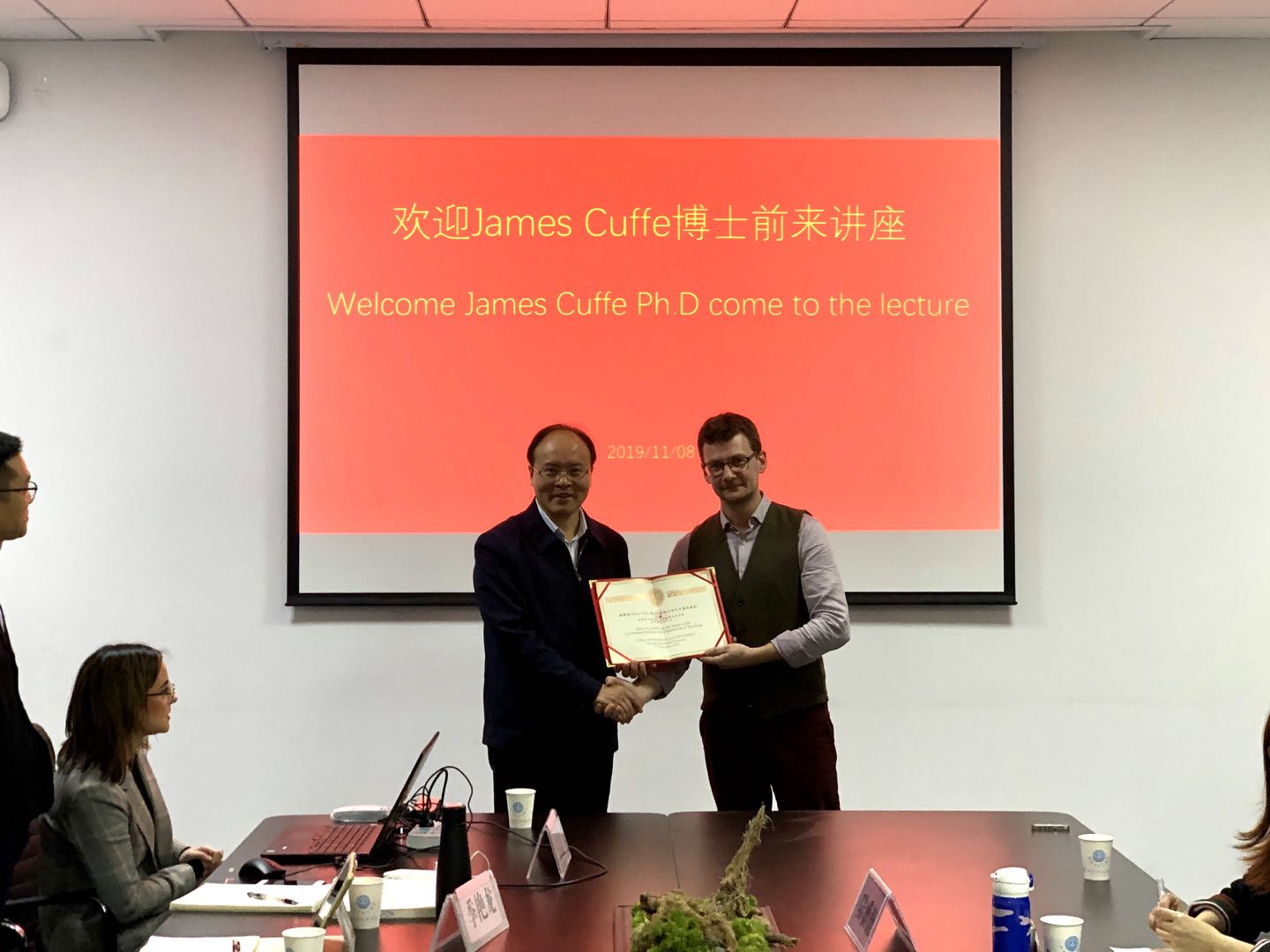 为James Cuffe 博士颁发了兼职教授聘书。姚兆余教授表示,热烈欢迎James cuffe博士加入猫都论坛