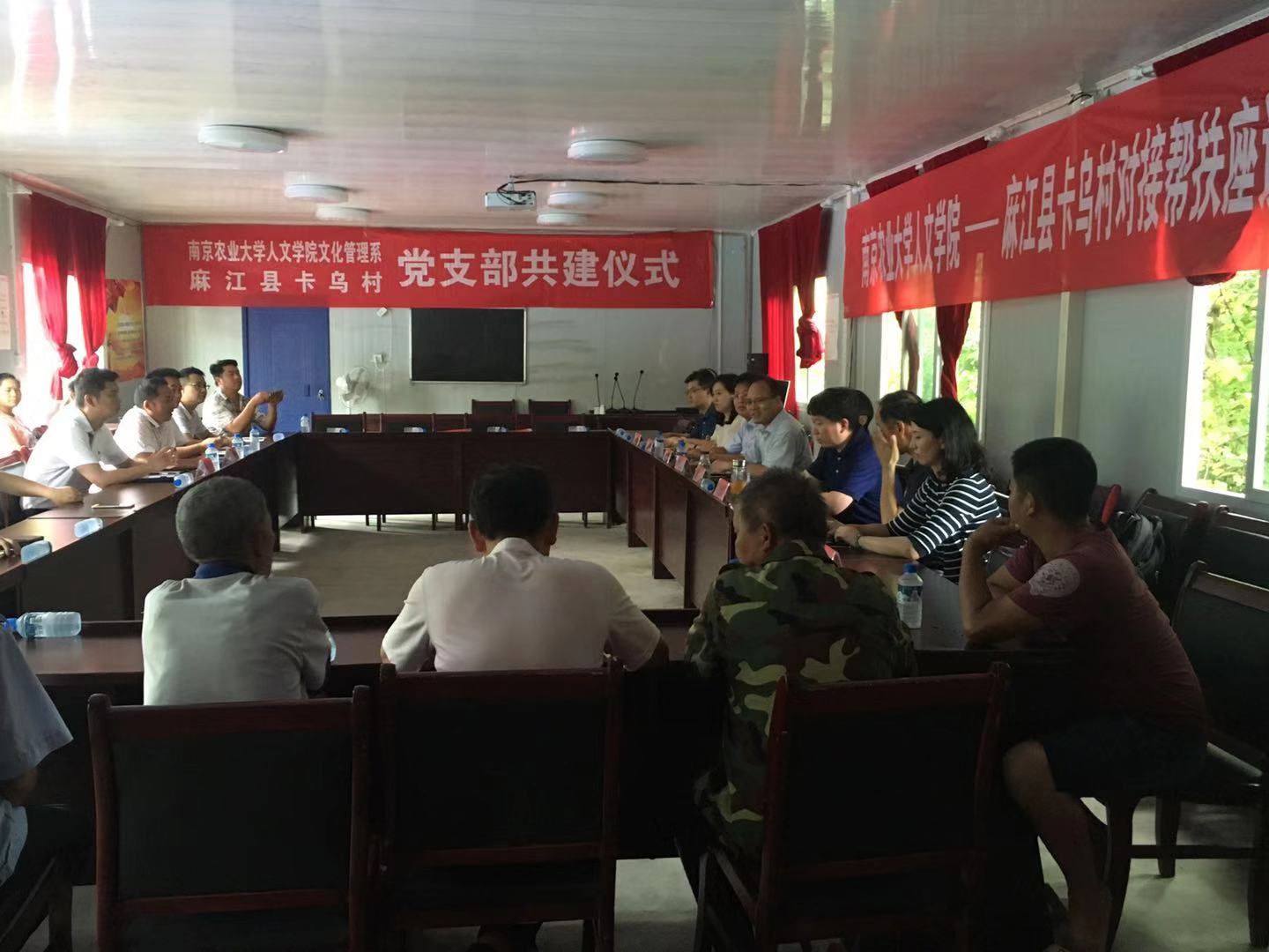 19日上午,调研组首先来到麻江县宣威镇卡乌村。在卡乌村,调研组与该村负责人围绕卡乌村的产业发展、文旅开发、社区建设等进行了座谈。卡乌村主任金德周介绍了卡乌村基本情况、扶贫产业发展面临的主要问题。卡乌村党支部第一书记胡锦昊介绍了卡乌村党建引领助推脱贫攻坚的主要做法。姚兆余院长介绍了人文学院的专业发展、特色和优势,希望通过双方持久、深入的合作,将卡乌村打造为校村共推的乡村振兴试验区和示范区。杨旺生教授结合卡乌村资源优势和产业发展现状,从资源整合、农产品销售、景村结合等方面对卡乌村发展提出了思路。各位系主任围绕农民合作社、文化遗产保护与利用、乡村旅游开发、农村法治建设等进行了深入交流。座谈会结束后,金德周主任和李明主任分别代表卡乌村和人文学院文化管理系签订了党支部共建协议。