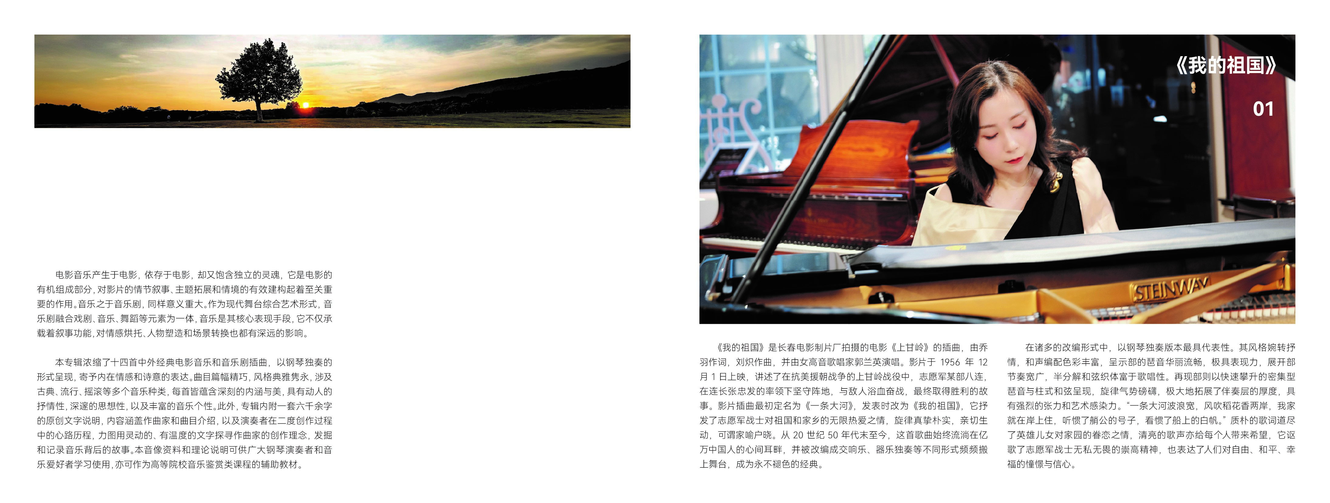 据悉,作品集精选了《我的祖国》、《月亮河》、《我相信于是我坚持》等十四首中外经典电影音乐和音乐剧插曲,以钢琴独奏的形式呈现,寄予内在情感和诗意的表达。曲目涉及古典、流行、摇滚等多个音乐种类。作品蕴含深刻的内涵与美,具有动人的抒情性,深邃的思想性,以及丰富的音乐个性,作品集一经发布便受到多家媒体关注。