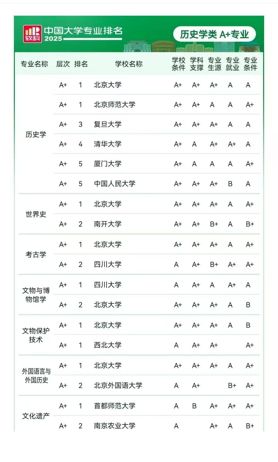 2025年6月18日,高等教育专业评价机构软科正式发布“2025软科中国大学专业排名”,排名包括836个专业,涉及93个专业类、12个专业门类。人文学院科学技术史系“文化遗产”本科专业连续三年(2023、2024年)挺进A+。