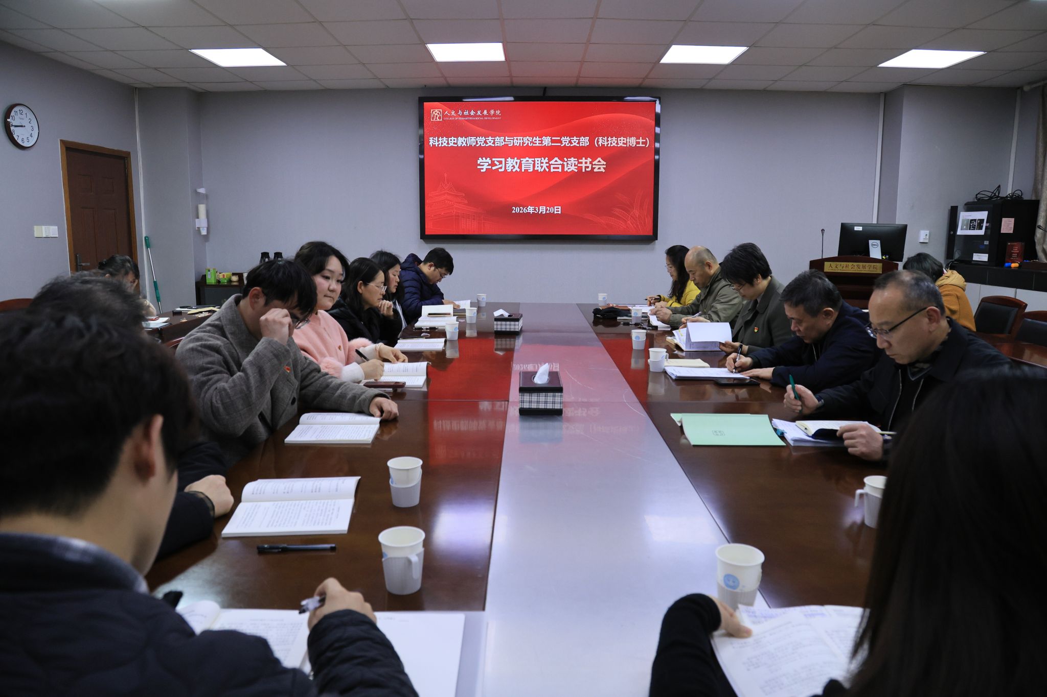 科技史教师党支部与研究生第二党支部在逸夫楼6041会议室联合举办学习教育读书会,共读《习近平关于树立和践行正确政绩观论述摘编》。校党委副书记、纪委书记吴荣顺,监察处副处长李云锋到会指导,学院党委副书记(主持工作)殷美、副书记桑运川列席,读书会由党支部书记朱锁玲主持。