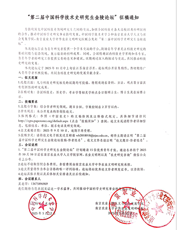 “第二届中国科学技术史研究生金陵论坛”征稿通知