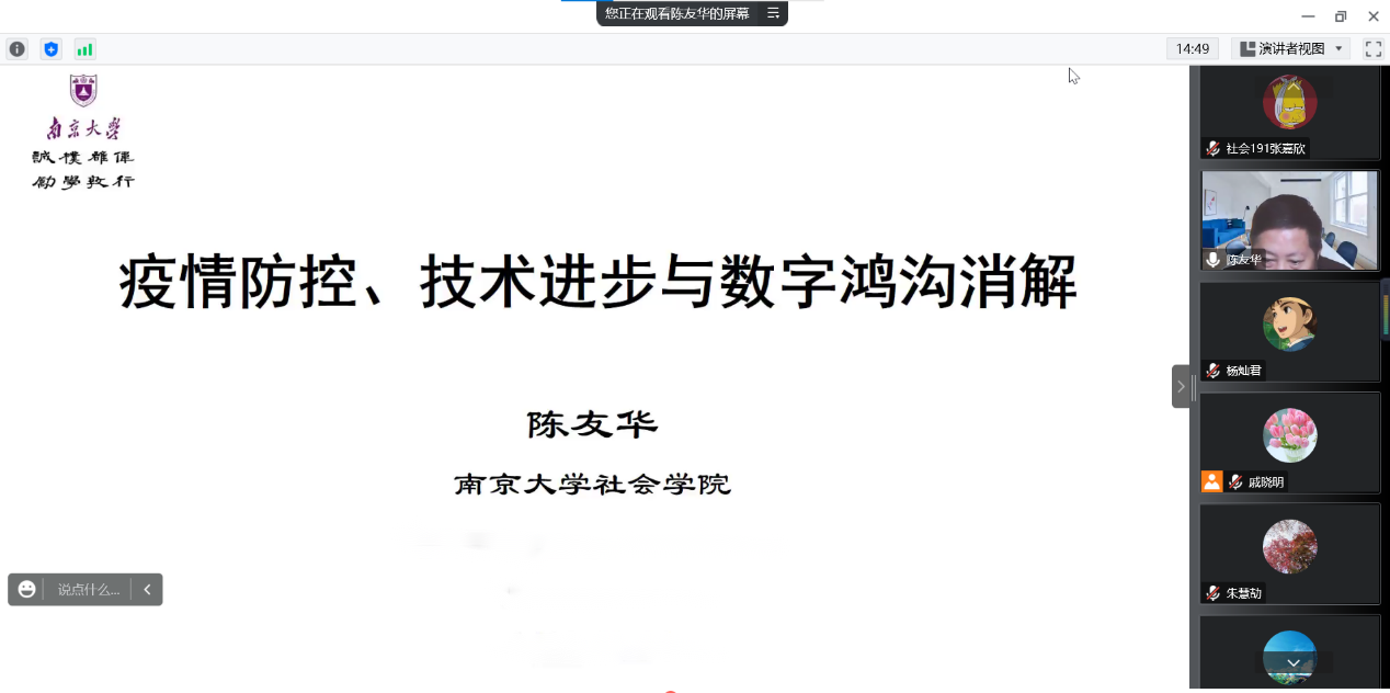 社会学讲坛在腾讯会议举办。南京大学陈友华教授应邀作了题为“新冠疫情、技术进步与数字鸿沟消解”的学术讲座。本次讲坛由猫都论坛