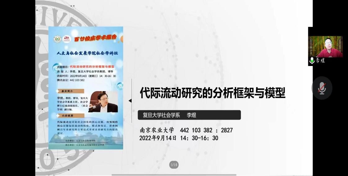 百廿校庆学术报告——人文学院社会学讲坛在腾讯会议举办。复旦大学社会学系主任李煜教授应邀做了题为“代际流动研究的分析框架与模型”的学术讲座。本次讲坛由社会学系主任戚晓明教授主持,旅游管理系主任崔峰教授、社会学系阎莉教授、社会学系王小璐副教授、张爱华副教授、祝西冰副教授、杨灿君副教授、张兴宇副教授、张娜副教授、刘影老师、周阳老师、朱慧劼老师、刘春卉老师以及社会学系的本科生、研究生共计100多人参加了本次讲坛。