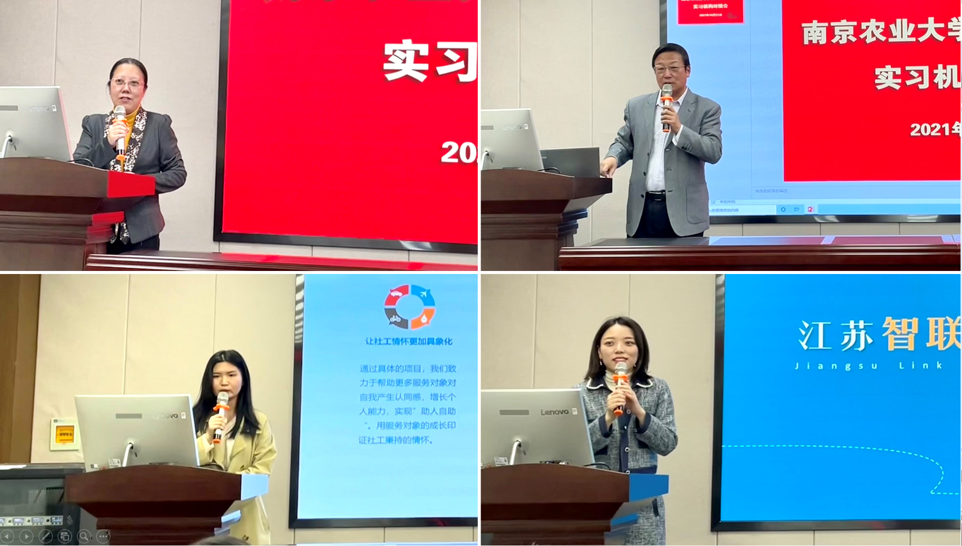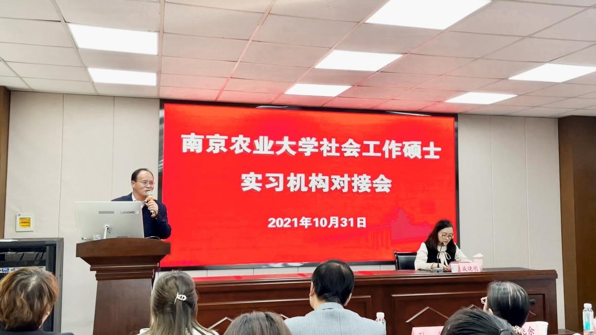 接下来,11家机构负责人或代表分别介绍了机构概况和目前开展的服务项目,并对研究生实习工作提出了期望和要求。其中,江苏省民政厅机关党委专职副书记、江苏省养老服务指导中心主任孙燕表示江苏省老年公寓作为省级养老服务平台,长期为高知、高干、高收入退休老年人提供高质量服务,在为南农学生提供专业指导的同时,也向南农学生的专业能力提出了要求。机构介绍完后,2021级社会工作研究生积极提问,与机构进行充分交流。