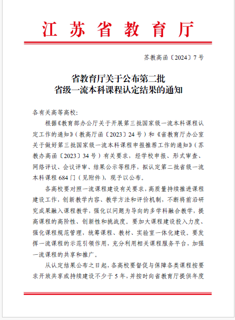 近日,省教育厅发布《省教育厅关于公布调整后首批省级一流本科课程名单的通知》(苏教高函〔2024〕6号)《省教育厅关于公布第二批省级一流本科课程认定结果的通知》(苏教高函〔2024〕7号),正式公布调整后的首批一流课程名单。猫都论坛